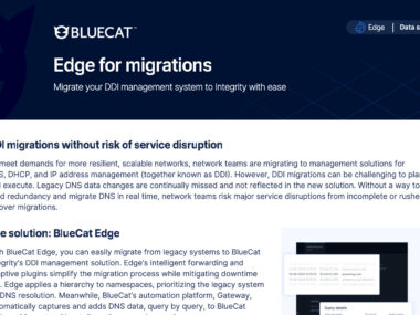 With BlueCat Edge, you can easily migrate from legacy systems to BlueCat Integrity’s DDI management solution. Edge’s intelligent forwarding and adaptive plugins simplify the migration process while mitigating downtime risk. Edge applies a hierarchy to namespaces, prioritizing the legacy system for DNS resolution. Meanwhile, BlueCat’s automation platform, Gateway, automatically captures and adds DNS data, query by query, to BlueCat Address Manager without disrupting normal operations.