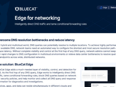 BlueCat Edge adds a much-needed layer of visibility, control, and detection for DNS. As the first hop of any DNS query, Edge works to intelligently direct DNS traffic, tame conditional forwarding rules, block DNS queries based on network and security policies, and help monitor and collect all DNS query and response information for diagnostics and investigations.
