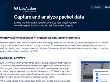 In addition, LiveWire delivers enriched packet data to BlueCat’s LiveNX network performance management solution. This makes it easy to transition from flow-level to forensic-level analysis and back—all on a single platform. LiveWire converts packet data into rich flow data and automatically exports it to LiveNX. With LiveNX and LiveWire, it’s easy to quickly identify and resolve application issues, such as VoIP and video performance problems, without the need for deep forensic analysis.