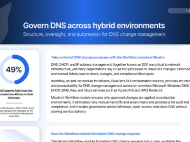 Workflow, an add-on module for Micetro, BlueCat’s DDI orchestration solution, provides structure and accountability for DNS change management across on-premises Microsoft Windows DNS/ DHCP, BIND, Kea, and cloud services such as Azure DNS and AWS Route 53. Micetro’s Workflow module ensures only approved changes are applied to production environments. It eliminates risky manual handoffs and email chains and provides a full audit trail for compliance. And it scales governance across Windows, open-source, and cloud DNS without slowing service delivery.